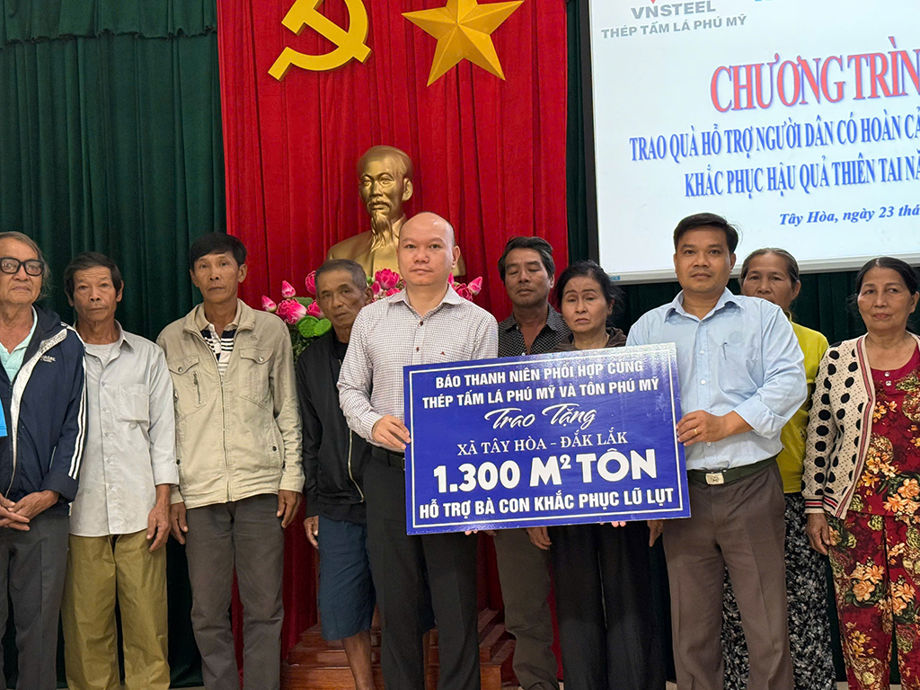 Trong hai ngày 22 – 23.12, Báo Thanh Niên phối hợp Công ty TNHH MTV Thép tấm lá Phú Mỹ và Công ty TNHH Tôn Phú Mỹ trao 2.900 m² tôn cho người dân xã Nam Khánh Vĩnh và xã Tây Hòa, kịp thời giúp bà con dựng lại nhà ở, sớm ổn định cuộc sống sau mưa lũ.